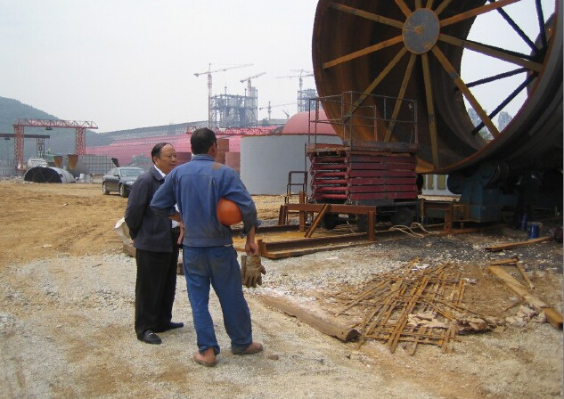公司董事長(zhǎng)朱文清專程趕赴蕪湖繁昌Φ6.2×96m回轉(zhuǎn)窯筒體制作現(xiàn)場(chǎng),公司總工程師濮理金同志陪同前往。董事長(zhǎng)慰問(wèn)了現(xiàn)場(chǎng)露天工作的職工們,強(qiáng)調(diào)現(xiàn)場(chǎng)工作安全第一,并對(duì)前期工作予以充分的肯定。對(duì)下一步的工作提出了要求,希望同志們?cè)俳釉賲枴⒖朔щy做好接下來(lái)的各項(xiàng)工作,出色完成這次艱巨的任務(wù)。