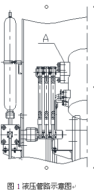 圖1所示為液壓缸與蓄能器間的連接管路,為實現(xiàn)蓄能器對液壓缸快速補壓緩沖作用,A處設計較大直徑管道接口,圖1中A處的原密封形式詳見圖2。圖2中的分油管一端連接高壓膠管,另一端焊接法蘭1,法蘭1與液壓缸法蘭采用螺栓連接,兩法蘭是采用一道端面O型圈(圖2中密封處1)實現(xiàn)密封。