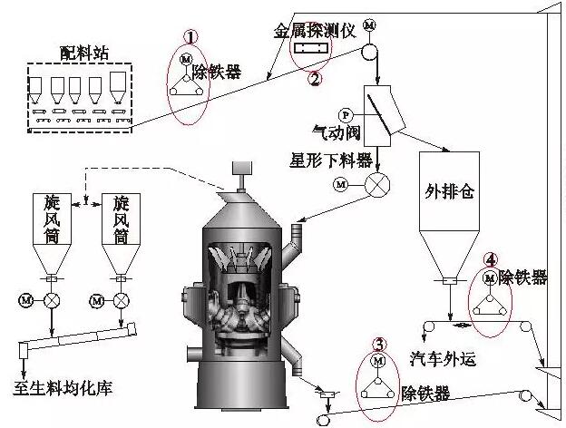立磨金屬剔除、檢測與旁路系統(tǒng)由集散型計算機控制系統(tǒng)(DCS)、金屬探測儀、電磁式除鐵器、永磁式自卸除鐵器、旁路氣動閥、外排倉等組成。