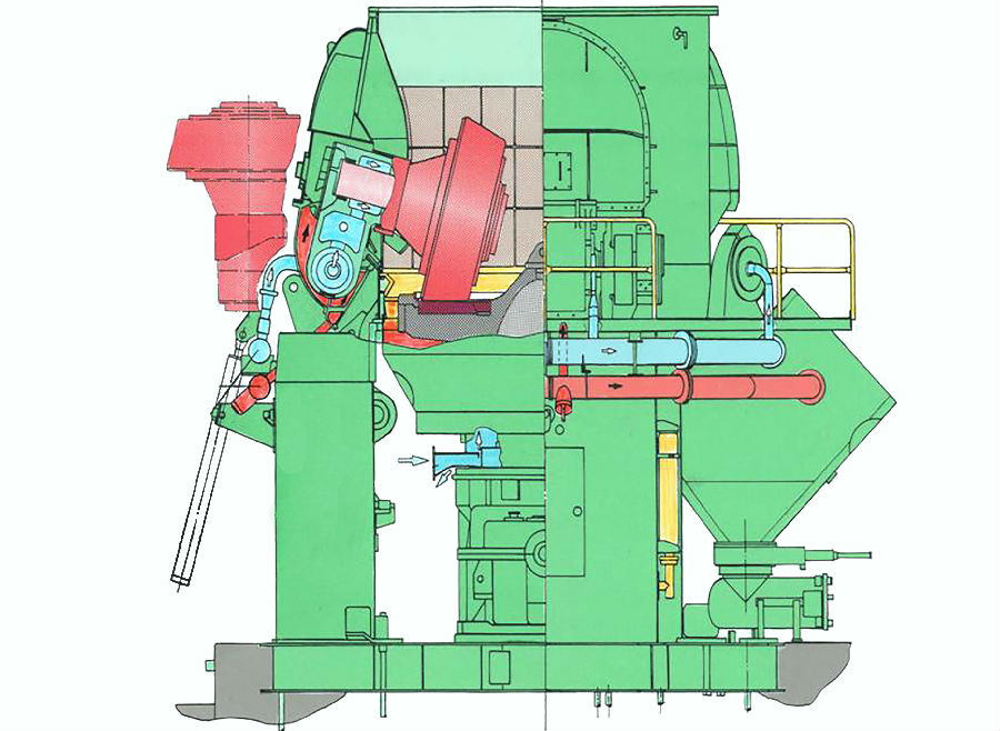 新型立磨主要由電動(dòng)機(jī)、減速機(jī)、磨輥裝置、磨盤裝置、加壓裝置、選粉機(jī)、機(jī)體、油站、主機(jī)PLC電控系統(tǒng)等部分組成。主電機(jī)通過減速機(jī)帶動(dòng)磨盤轉(zhuǎn)動(dòng),同時(shí)風(fēng)從進(jìn)風(fēng)口進(jìn)入立磨機(jī)體內(nèi),物料經(jīng)螺旋給料機(jī)下料口落在磨盤中央,在離心力的作用下,物料從磨盤中央向邊緣均勻移動(dòng),經(jīng)過磨盤上的粉磨輥道區(qū)域時(shí),受到磨輥的碾壓,大塊物料直接被壓碎,細(xì)粒物料受擠壓后形成料床進(jìn)行粒間粉碎。
