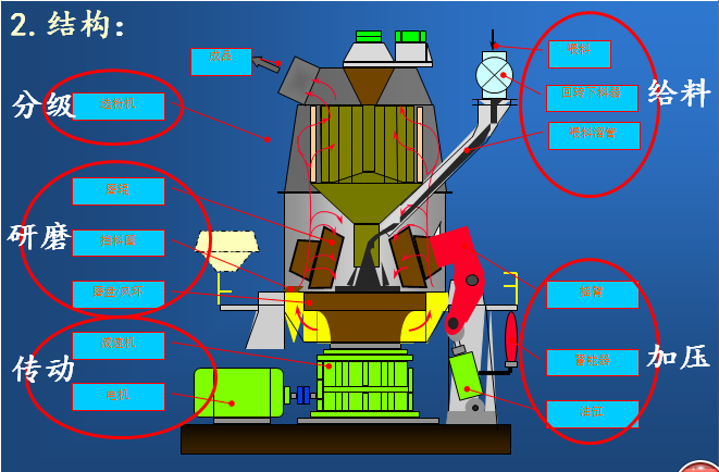 1、磨盤(pán):包括導(dǎo)向環(huán)、風(fēng)環(huán)、擋料圈、襯板、盤(pán)體、 刮料板和提升裝置等。