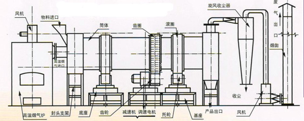 回轉式烘干機主要由回轉體、擋料板、傳動裝置、支承裝置等部件組成。其工作原理:利用擺布合理,角度交替變更均布于筒體內(nèi)的揚料板,把含水物料拋灑在旋轉的筒體內(nèi),經(jīng)熱氣流把水份從物料中分泌出來,變成水蒸氣排放于大氣中而進行干燥。