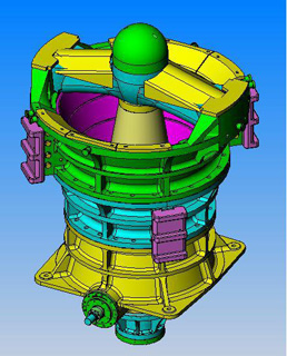 旋回破碎機(jī)由傳動、機(jī)座、偏心套、破碎圓錐、中架體、橫梁、原動、油缸、液壓、滑車、電氣和干、稀油潤滑等部分組成。電動機(jī)經(jīng)皮帶輪和圓錐齒輪帶動偏心套轉(zhuǎn)動,當(dāng)偏心套轉(zhuǎn)動時就帶動破碎圓錐繞破碎機(jī)中心作旋擺運(yùn)動。從而使破碎圓錐表面時而靠近時而離開固定圓錐表面,使給入破碎腔內(nèi)的物料不斷受到擠壓和彎曲作用而被破碎。被破碎的物料靠自重從破碎腔底部排出。